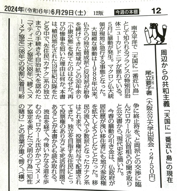 2024.6.29 『周辺からの共和主義「天国に一番近い島」の現在』尾立要子著の書評が毎日新聞(令和6年6月29日)の「今週の本棚」に掲載されました。 『周辺からの共和主義「天国に一番近い島」の現在』尾立要子著の書評が毎日新聞(令和6年6月29日)の「今週の本棚」に掲載されました。https://mainichi.jp/articles/20240629/ddm/015/070/010000c書評